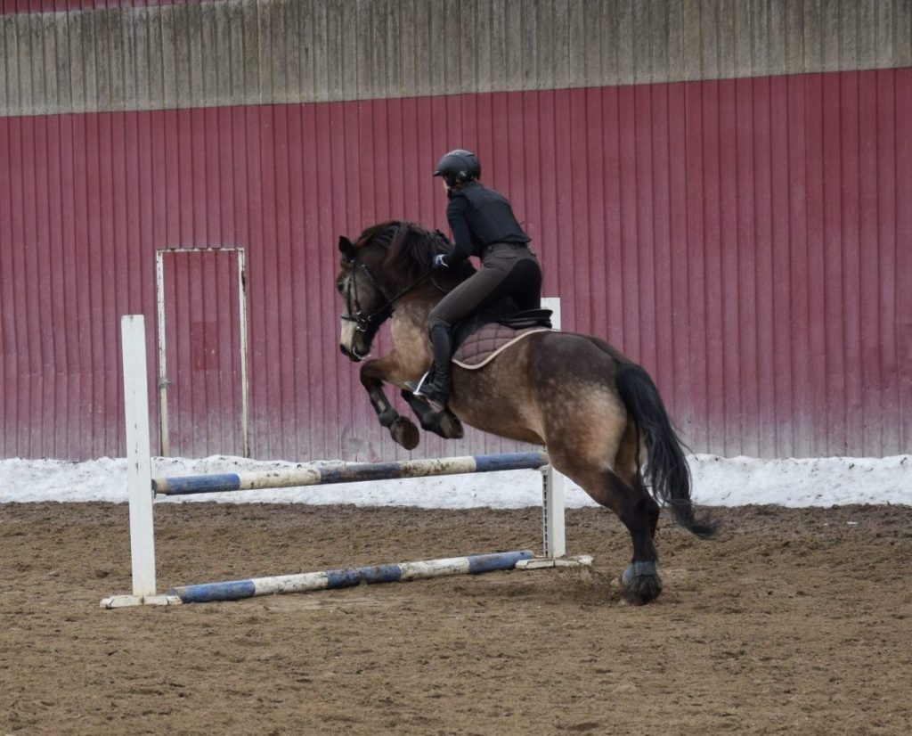 Aamupäivän tunti oli estetunti, ja minulla ei ollut erityisiä preferenssejä ratsun suhteen. Kun muut olivat valinneet, ehdotin voivani mennä Topilla tai Cadilla. Topi ei ollut ”mennyt kaupaksi” muille, mutta tykkään hypätä Topilla. Hän ei ehkä vakuuta kylmäverisen raskaalla olomuodollaan, mutta ylitimme viime kesänä 110cm korkeushyppykisassa. Cadi taas on minulle uusi tuttavuus ja vasta aloittelee ratsastuskoulu-uraansa, Cadi on ollut Miila Mättölän koulutuksessa ja kisaratsuna ennen tätä. Minna valitsi näistä minulle Topin, mutta onneksi Cadin vuoro oli sitten vielä sunnuntaina. 🙂