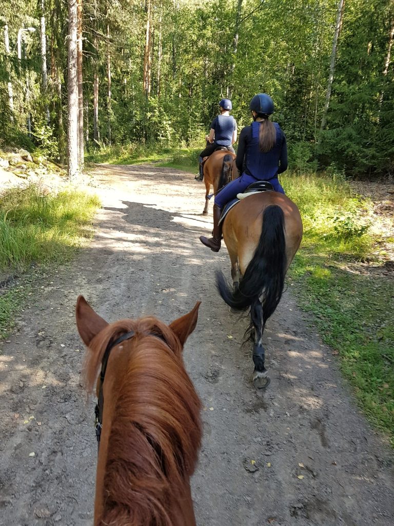 Lauantaina meillä oli kahdet maastoesteharjoitukset opiston urheilualueilla. Molemmat harjoitukset keskittyivät hiekkakentille ja niitä reunustavalle metsäalueelle, joilta löytyi mm. erilaisia tukkiesteitä ja banketteja. Treenasimme maastoesteratsastuksen peruspilareita, kuten kevyessä istunnassa vaikuttamista, oikeaa asentoa ylös- ja alashypyissä sekä laukan rytmin hallintaa eripituisilla lähestymisillä esteille. Harjoitusten välissä ehdimme käydä katsomassa Opistohallilla samana viikonloppuna järjestettyjä vikellyksen SM-kisoja ja samalla nauttimassa kisabuffetista.